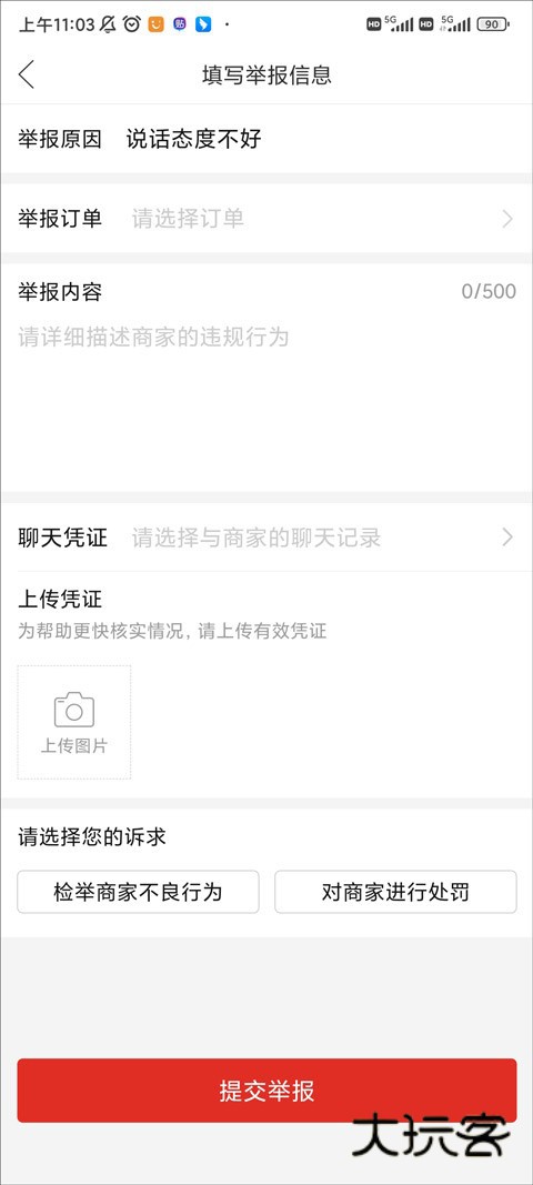 7、完成举报信息的填写,需要填写你的订单号、凭证等等,点击【提交举报】,即可完成投诉。