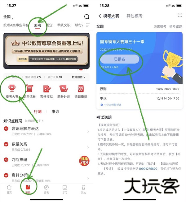 如何参加模考:中公教育App【刷题】页面——点击模考大赛——点击报名