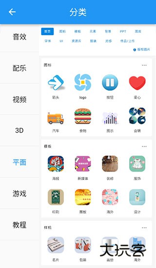 3、点击左上角就直接进入竖版的分类,左侧是类型,例如“平面”中就有“图标”、“模板”以及“样机”等,而“图标”又被分为“箭头”“Logo”“食物”“汽车”等等。