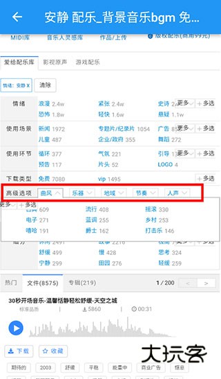 4、这里以“配乐”-“安静”为例,进入后在“高级选项”处可以更改自己的筛选条件,然后底部就会显示可供下载的资源了。