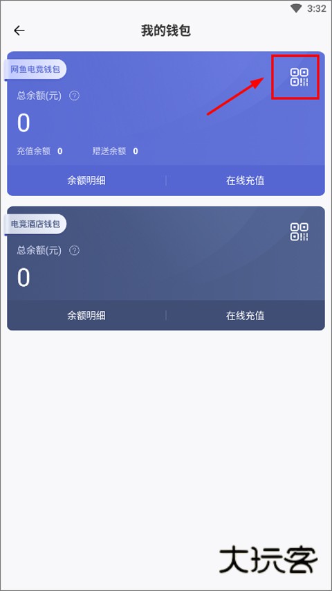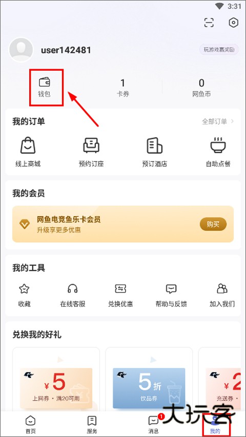 1、首先打开网鱼网咖app,点击右下角“我的”,然后登录账号,点击钱包;