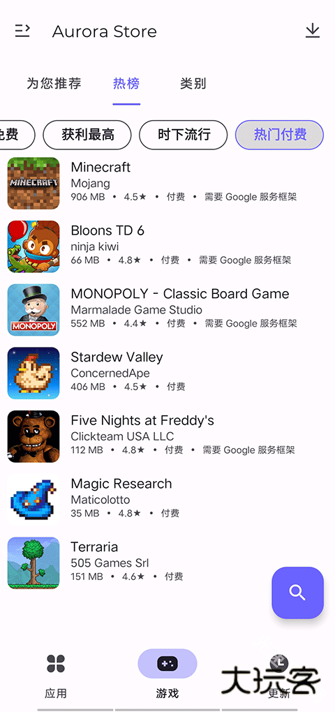 作为Play Store的替代品,Aurora Store应用程序允许您下载超过一百万的社交,商业,体育,休闲,工具和许多其他类别的应用程序和游戏。