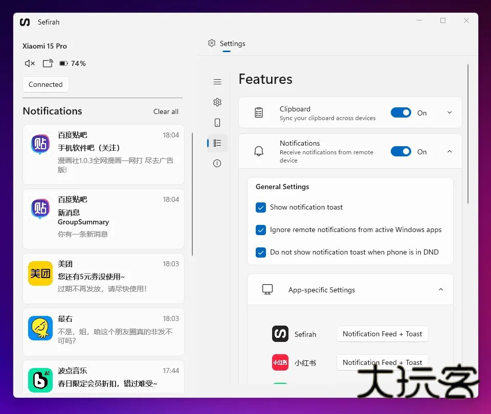 4、功能集成:集成了多种实用功能,如剪贴板同步、文件传输、通知同步等。