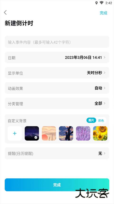 3、选择一个倒计时事件,输入日期和单位等等,然后设置背景,点击完成即可