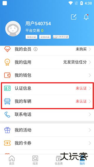 4、找货之前,我们需要在设置中找到认证信息和车辆认证,这样才能可以继续接下来的操作。