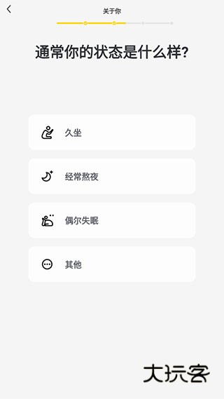 3、软件还要了解你的日常状态,你是久坐的上班族还是经常熬夜的夜猫子?或者其他类别,从你的日常状态可以了解到平时身体可能缺乏的是哪种锻炼。