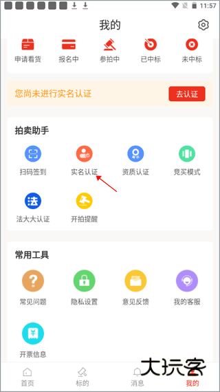 1、注册登录软件账号之后,进入软件首页,点击切换到“我的”界面,点击拍卖助手的“实名认证”。
