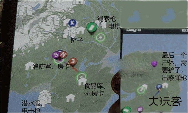 2.雪山周围的山洞可以不用探索,目前开局下山靠外的三个山洞为主要道具获取点,紫色感叹号如果到地方听见了声音但是找不到尸体可以晚上找。
