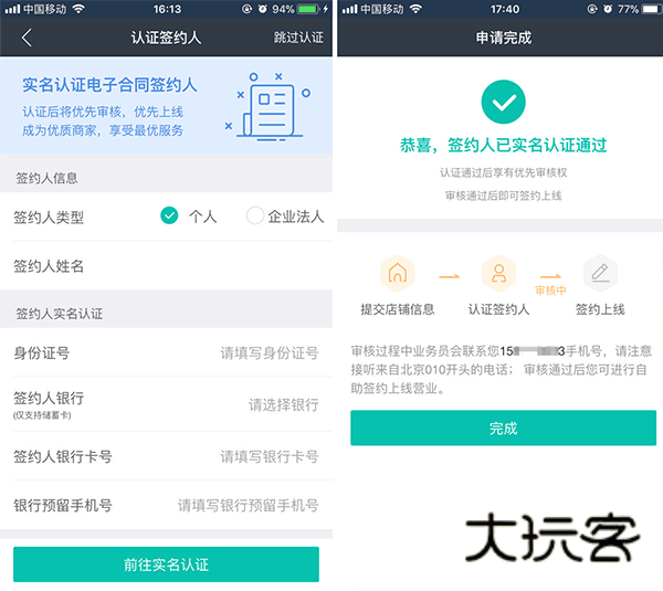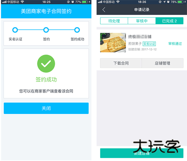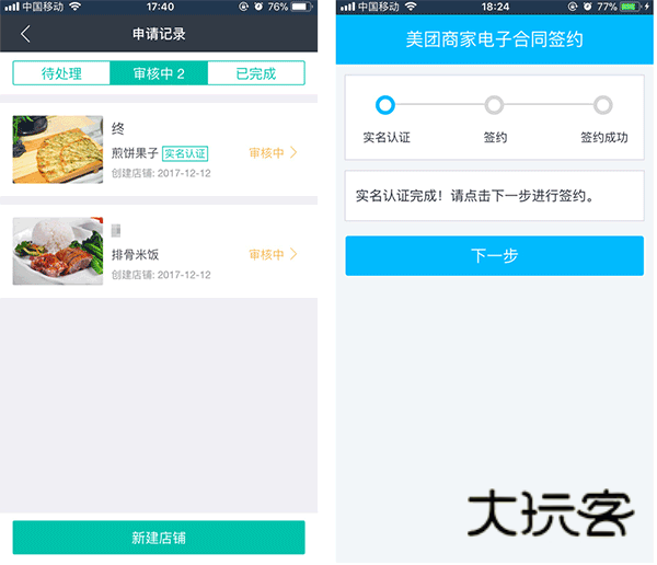 5、完成资料提交及实名认证后,美团工作人员将在1-3个工作日内进行审核,结果将会以短信形式发送到联系人手机上,注意查收。当您的店铺通过审核后会收到一条签约短信,根据短信提示完成线上签约即可登录开店营业啦!