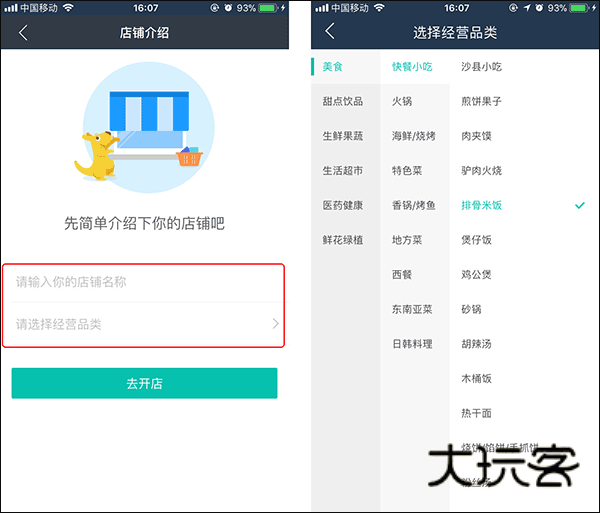 3、上传资料前需填写店铺名称及真实经营品类,美团外卖覆盖多种品类,确认后点击#去开店#。