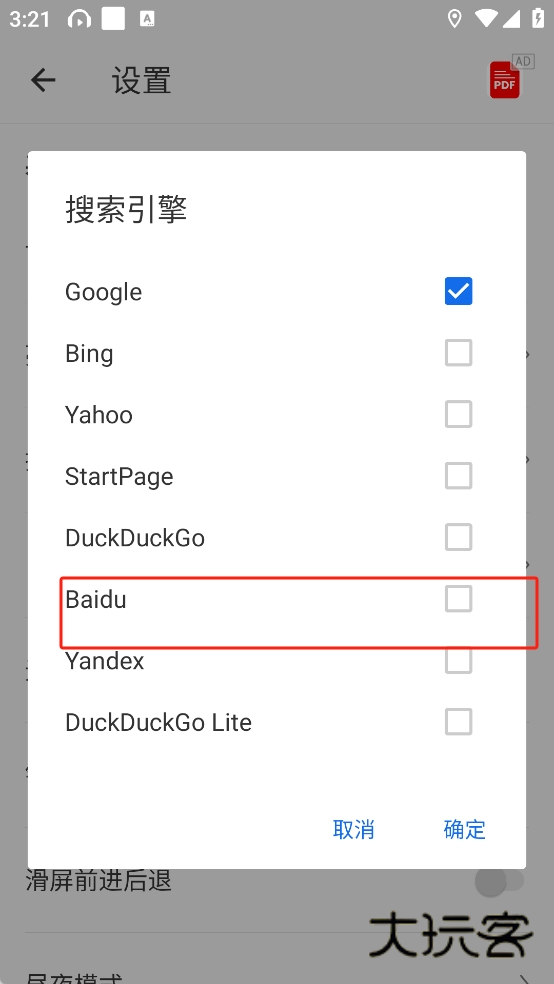 3、找到搜索引擎一栏,将google改为baidu,默认搜索引擎就从谷歌变成了百度,就可以在国内使用了。