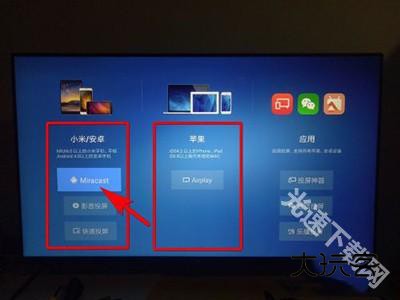 2、然后进入设置选择界面,可以看到有两种无线连接功能,一种是安卓/小米的Micracast无线连接,还有一个是苹果手机的Airplay功能,这里我们选择头一个安卓手机的Micracast连接。