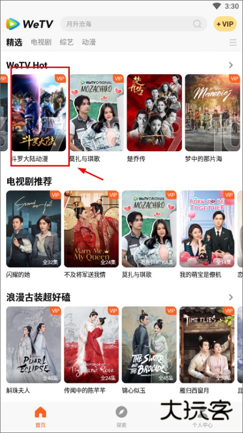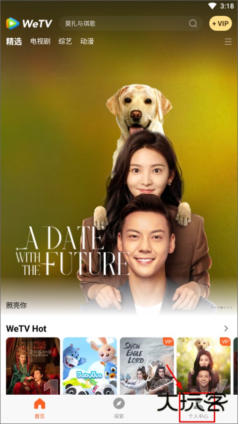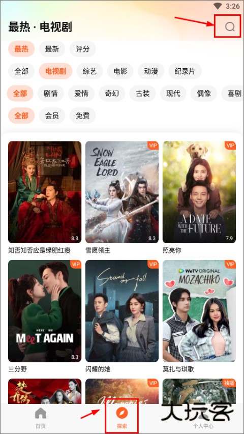 1、打开wetv国际版,点击“探索”,然后点击右上角“放大镜”;