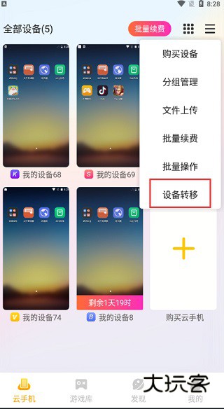 1、在云手机界面,点击右上角三条杠,点击“设备转移”。