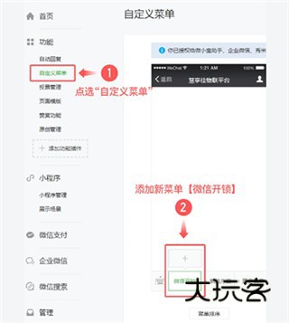 2、点击自定义菜单,然后点击添加新菜单微信开锁(菜单名字可以自定义);