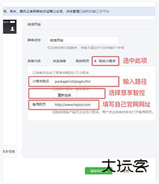 3、根据页面填写信息:菜单内容选择跳转小程序,填写小程序路径: packageList/ pages/index,小程序搜索选择:慧享智控,填写备用网页:酒店/公寓自己的官网;