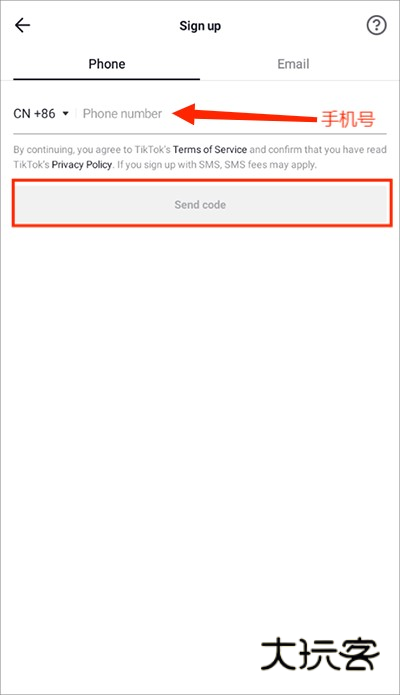 4、输入手机号码或者邮箱号,点击“Send code”注册。