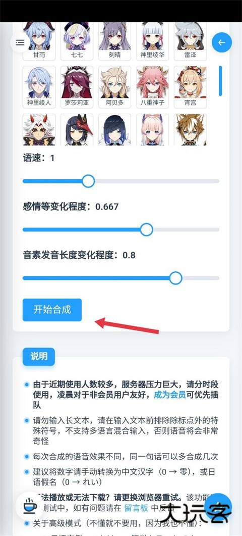 支持语音合成所有源信冲击字符。选择一个字符并输入文本后,就可以实现个性化的语音合成。