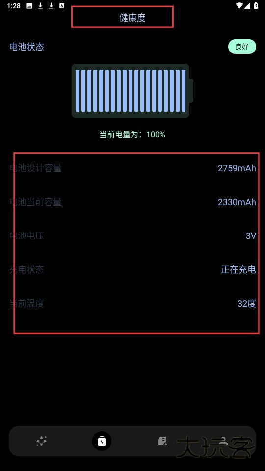 4、在应用的健康度页面,可查看电池状态、电量等详细信息。