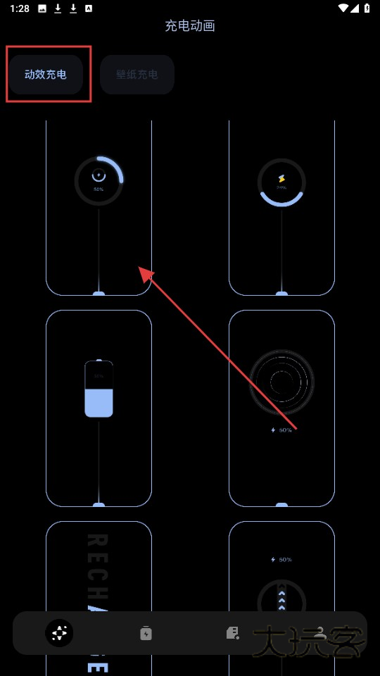 1、在充电动画设置页,点【动效充电】可查看动效类充电动画。