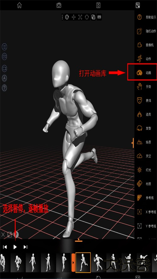4.同样的,可以选择“动画库”,点击逐帧播放功能,可以对动画进行前进、倒退、逐帧播放。这样可以直接抓取动态动作。