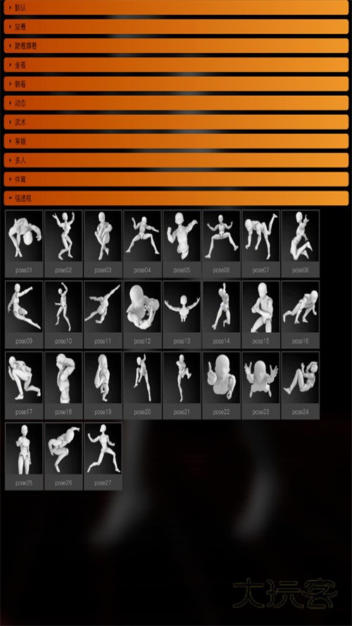 丰富的动作,动画库,通过Pofi云数据库,不定期更新,访问常见的姿势。贴近各类主题,使用简单,不需要熟悉人体结构,就能得到合理的人偶动作姿势。