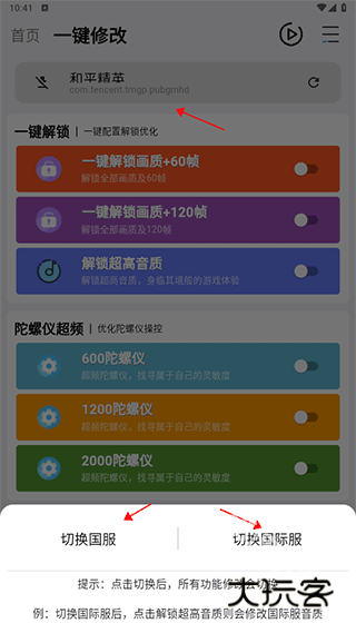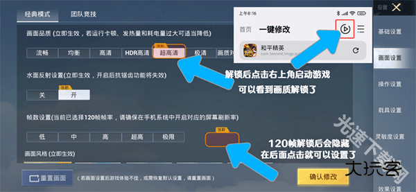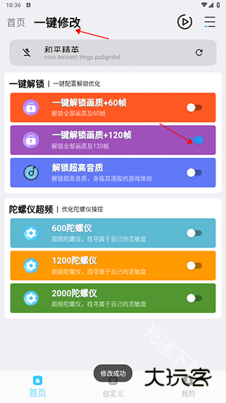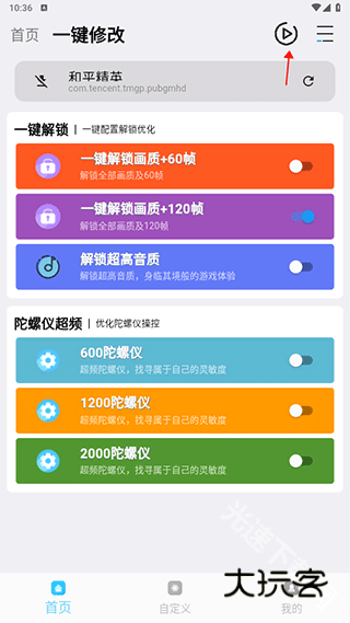 1、在本站下载后进入首页,点击上方的一键修改和一键解锁画质+120帧(开启前需要给软件授权)