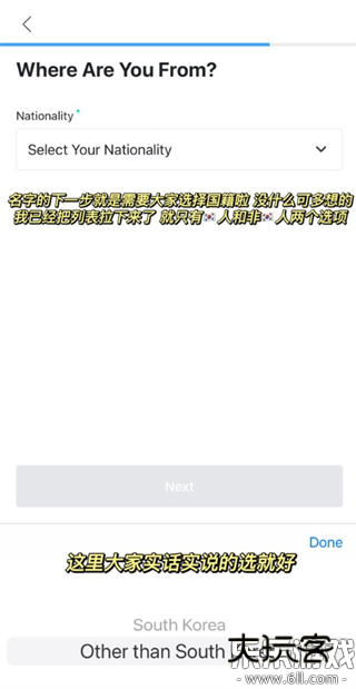 7、名字的下一步就是需要大家选择国籍啦,没什么可多想的,列表拉下拉就只有韩国人和非韩国人两个选项