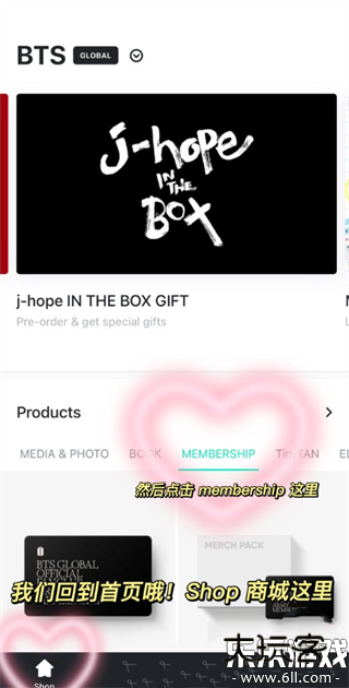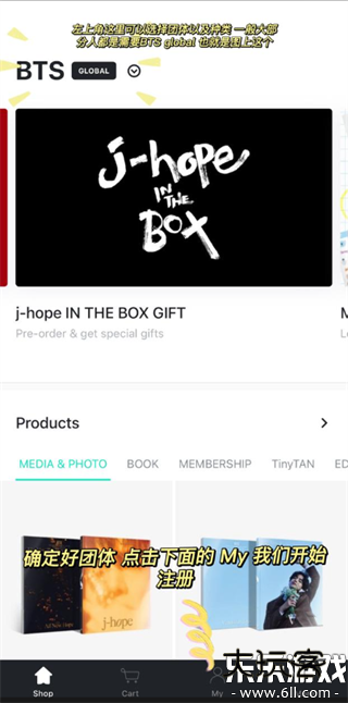 1、左上角这里可以选择团体以及种类,一般大部分人都是需要BTS global,也就是图上这个,确定好团体,点击下面的MY,我们就开始注册