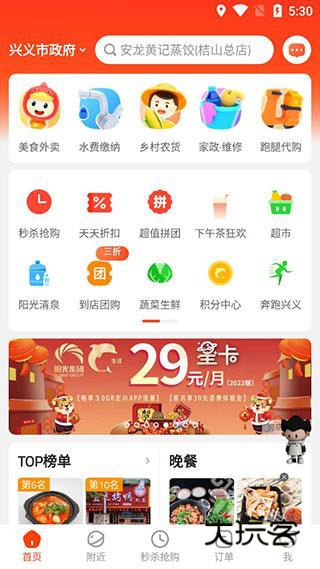 1、安装好软件,打开进入首页,有美食外卖、水费缴纳、乡村农货、家政维修、跑腿代购,还有秒杀抢购、拼团等,买菜去超市都可以在里面找到。