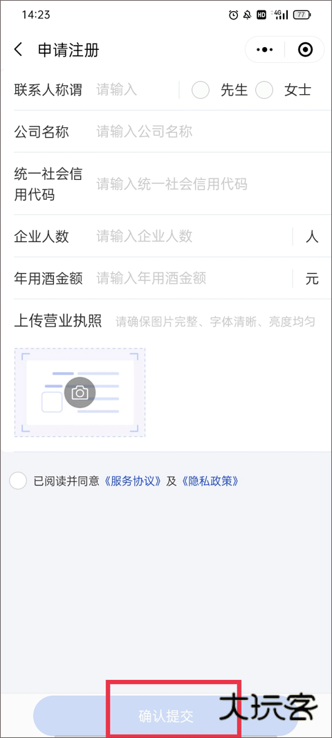 5、填写申请注册表,就是输入具体的企业信息:联系人称谓、公司名称、统一社会信用代码、企业人数,上传营业执照等,最后点击确认提交就可以了。