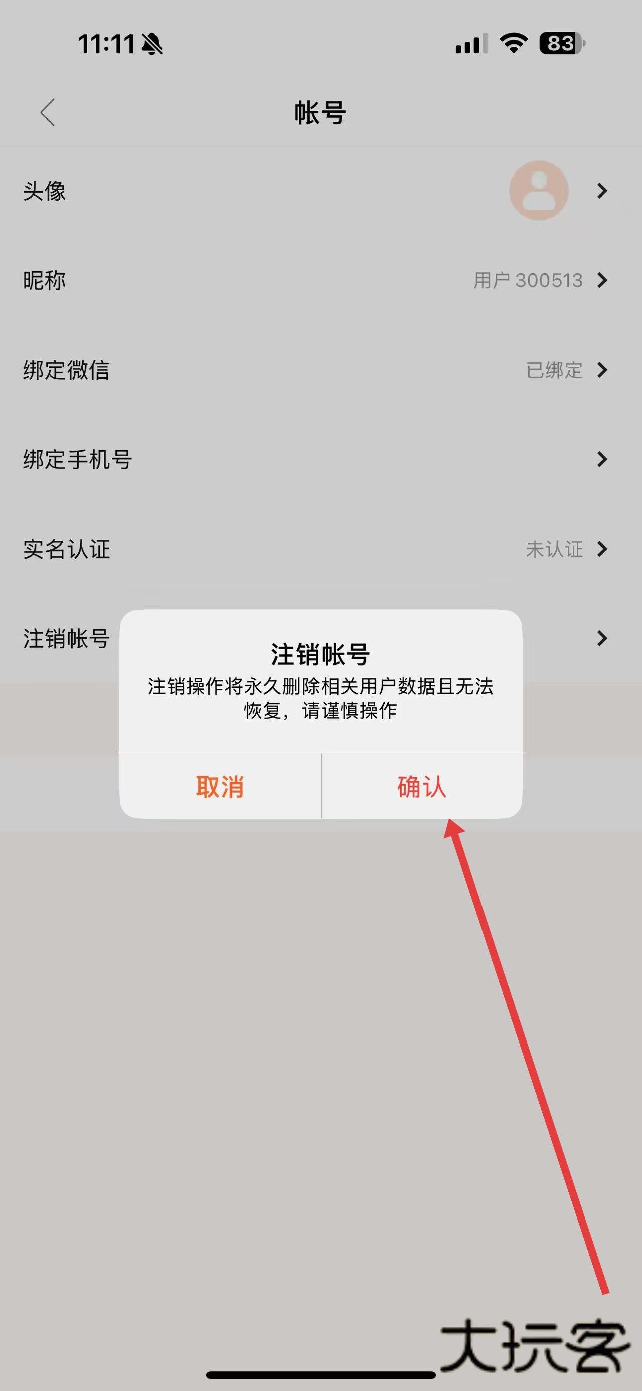 4、在弹出的确认提示框中,仔细阅读提示内容,确认注销操作将永久删除相关用户数据且无法恢复,点击确认,即可完成账号注销。