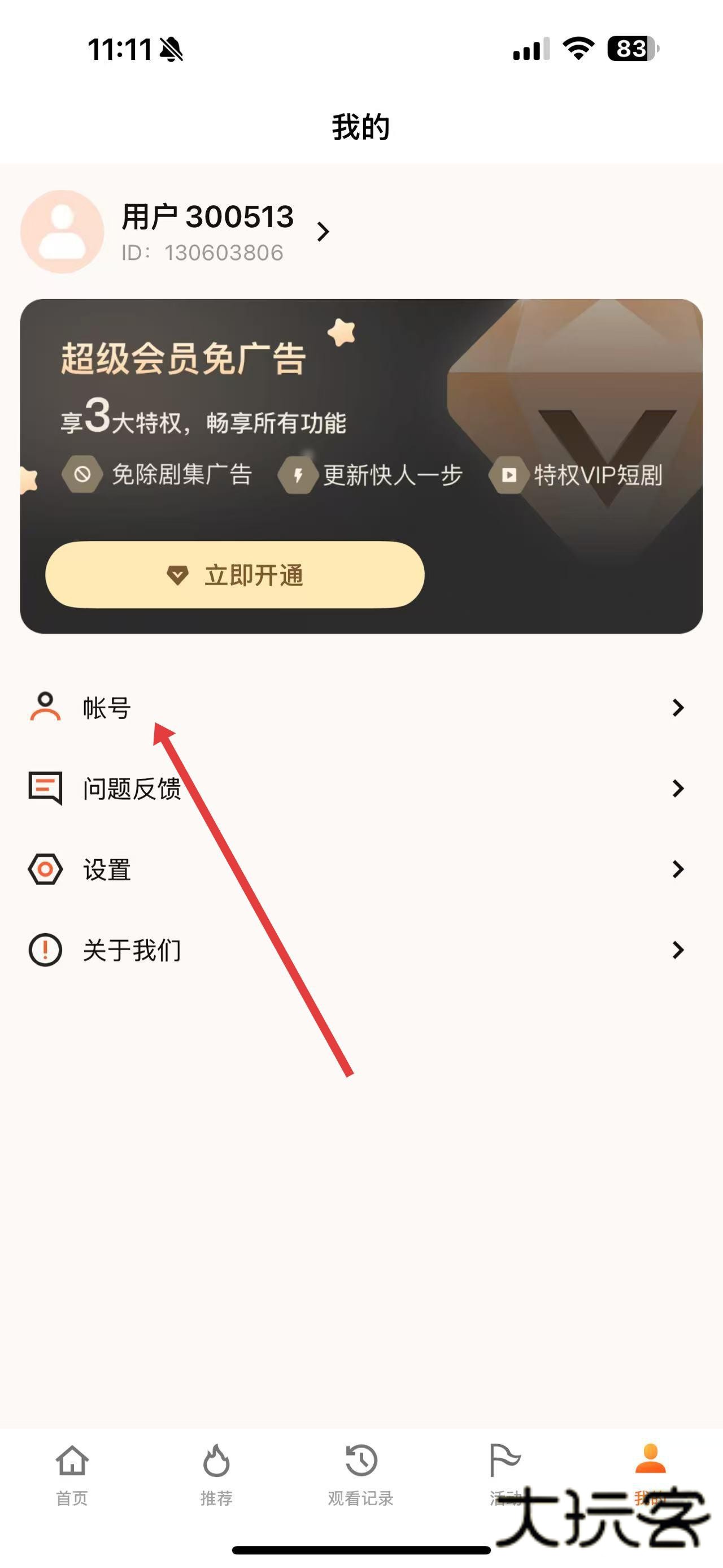 2、在个人页面中,点击帐号选项,进入帐号设置界面。