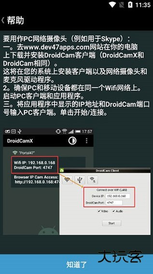 支持 WiFi 与 USB 连接,Android 端需要安装应用,PC 端也需要安装,之后只需要输入 IP 地址点击 Start 就能在电脑上看到手机摄像头的实时内容了。