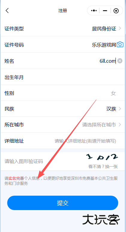 5、完善个人信息:证件类型、证件号码、姓名、出生年月、性别、民族、所在城市以及详细地址,都要完整填写清楚,完成后点击“提交”。