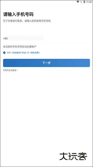 1、首先我们需要在飞马出行司机端app中完成【注册登录】,输入手机号后点击下一步进行登录;