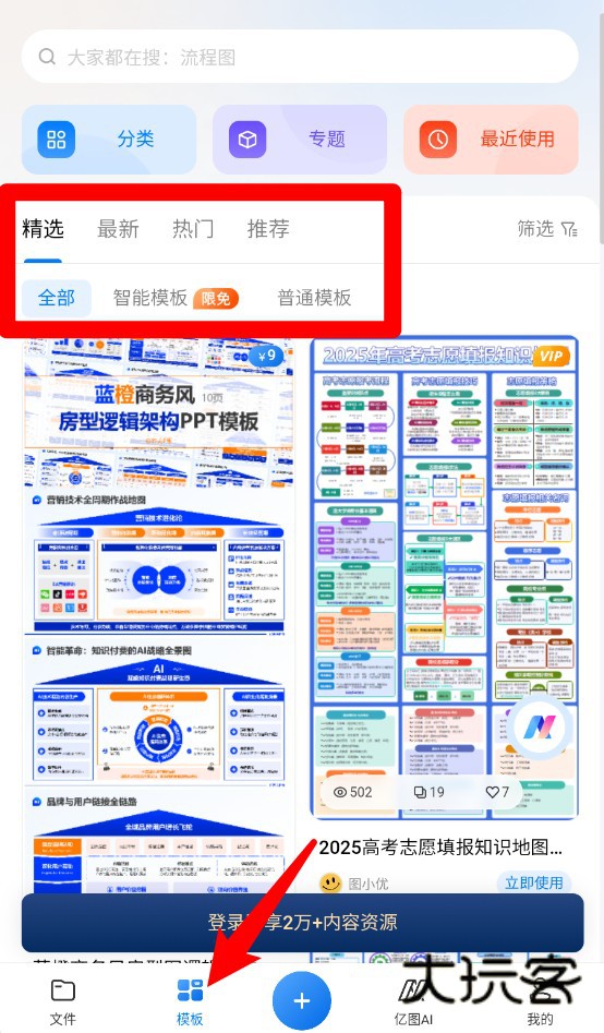 1、模板页面可浏览精选、热门等分类内容,并筛选智能或普通模板,查找更高效。