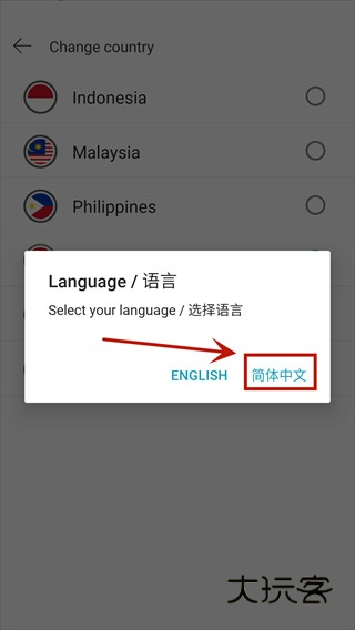 3、点击国旗图标将地区设置为新加坡,点击continue后,在弹出的对话框内选择简体中文即可设置成功。
