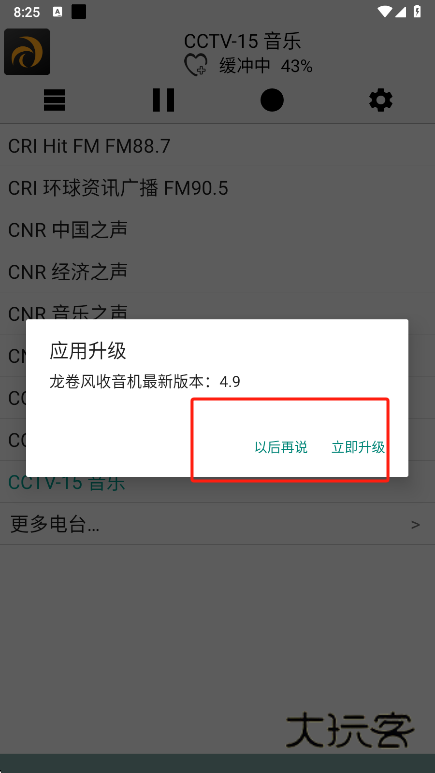 1、在本站下载安装龙卷风收音机打开,会提升内部升级4.9,大家不要升级,点击以后再说,不然会闪退
