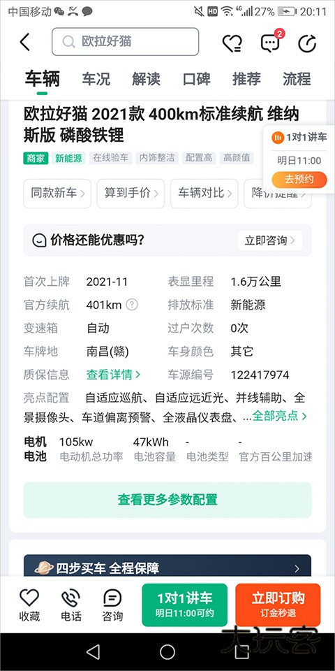 7、用户看完介绍后,可以点击页面底部的电话进行与卖方直接沟通,也可通过咨询与平台进行沟通,或点击【1对1讲车】进行预约线下看车。
