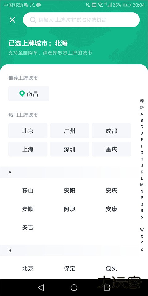 4、还可通过点击页面左上角的城市标签,切换城市来实现异地选购车辆;