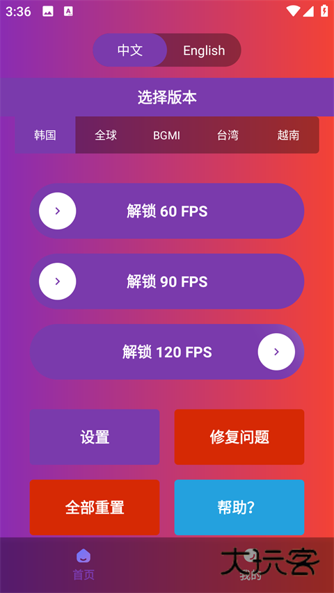 1、进入90fps画质修改器内先点击最上方中文来切换语言。