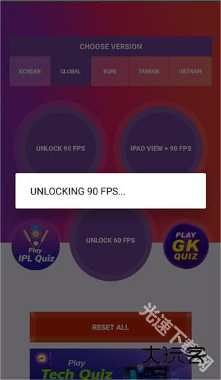 1、打开90fps画质修改器,选择全局模式GLOBAL,再点击解锁90帧模式;