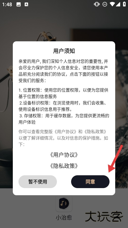 1、阅读《用户协议》和《隐私政策》,点击【同意】,进入小治愈APP。