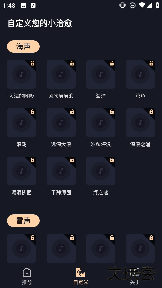 3、进入【自定义】页,选【海声】【雷声】分类下音效,自定义治愈声音。
