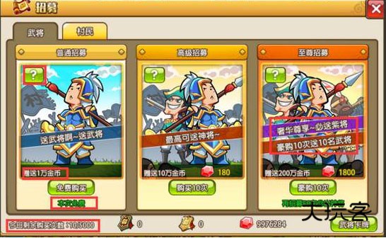 1、村长大人们可以在村庄界面下部点击【招募】→【武将】进入武将招募界面。每次招募都会额外赠送金币。
