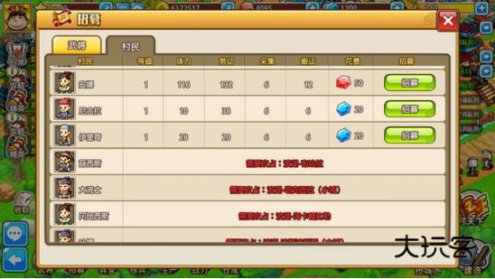 1、首先,村民需要通过村长大人们在主线关卡征战四方,击败相应关卡解锁相应村民后,才能在村庄左下角的【招募】→【村民】里进行招募。可以使用蓝钻或者红钻招募不同的村民。