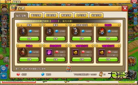 3、在【商城】→【宝殿】内,可以在【钻石宝殿】内使用蓝钻或者黄玉牌购买心仪的武将哟。