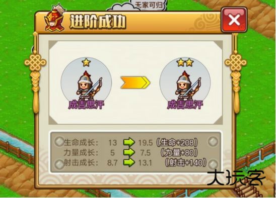 1、首先,武将进阶有什么用呢?武将进阶会大幅增加成长属性,从而提升各方面的属性。进阶一级加一星,最高为五星。