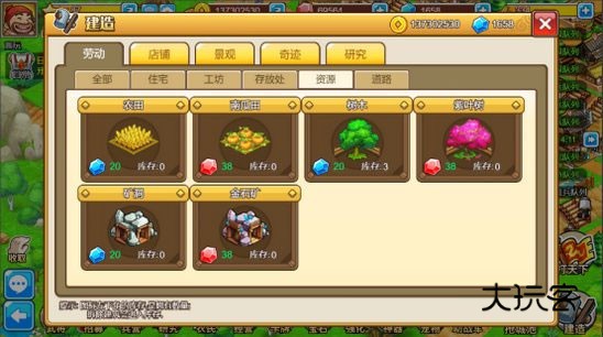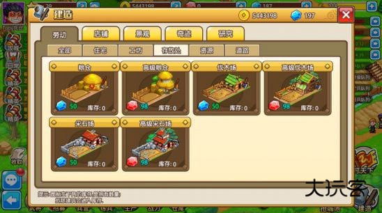 1、在【建造】→【劳动】→【资源】内可以看到小小村长的三大资源类型:农田和南瓜田可以保障小小村的粮食充足;树木跟紫叶,是小小村的木材保障;而石矿与金矿,则是小小村富强的彰显与代表!